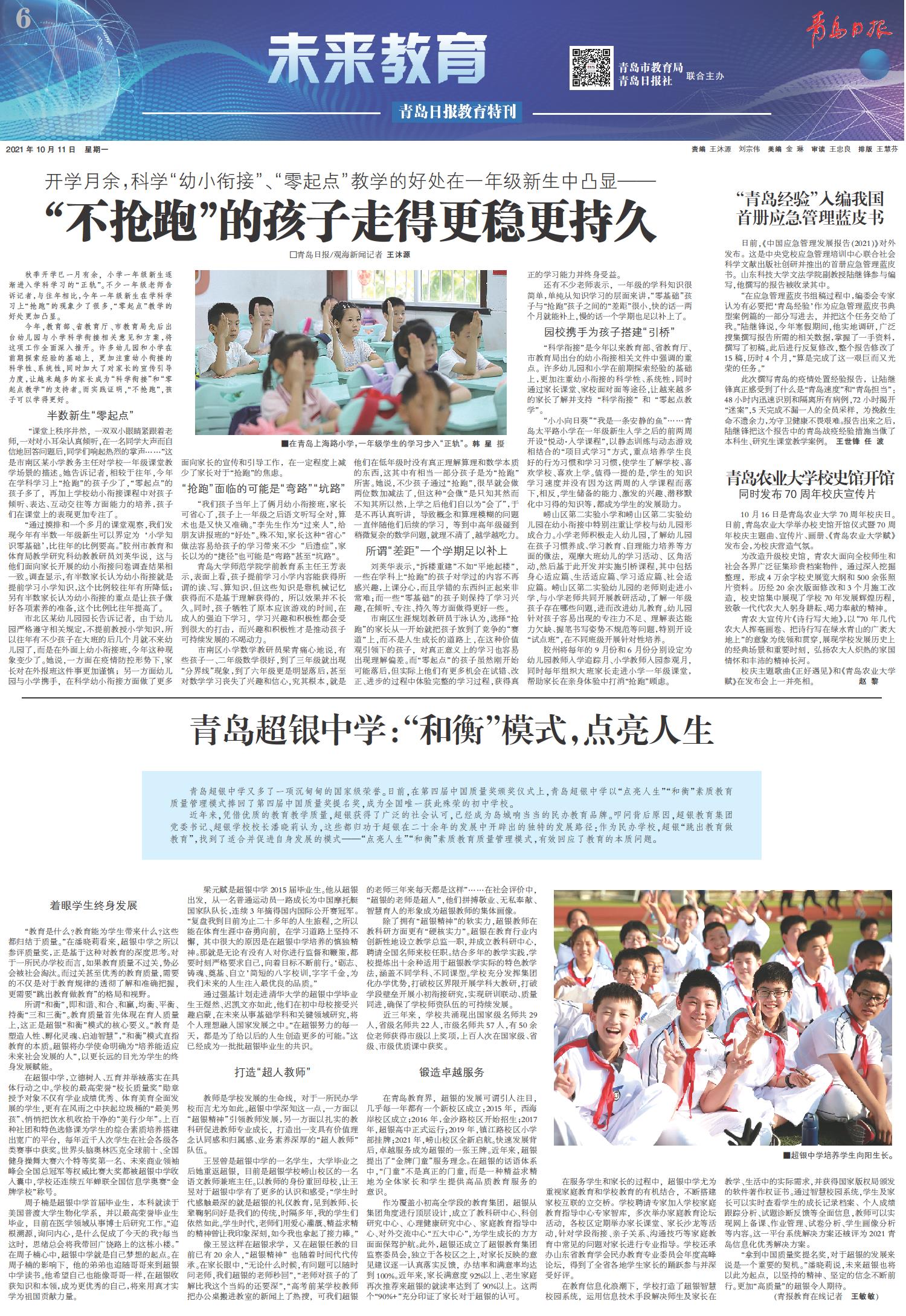 近年来,凭借优质的教育教学质量,超银获得了广泛的社会认可,已经成为岛城响当当的民办教育品牌。叩问背后原因,超银教育集团党委书记、超银学校校长潘晓莉认为,这些都归功于超银在二十余年的发展中开辟出的独特的发展路径:作为民办学校,超银“跳出教育做教育”,找到了适合并促进自身发展的模式——“点亮人生”“和衡”素质教育质量管理模式,有效回应了教育的本质问题。