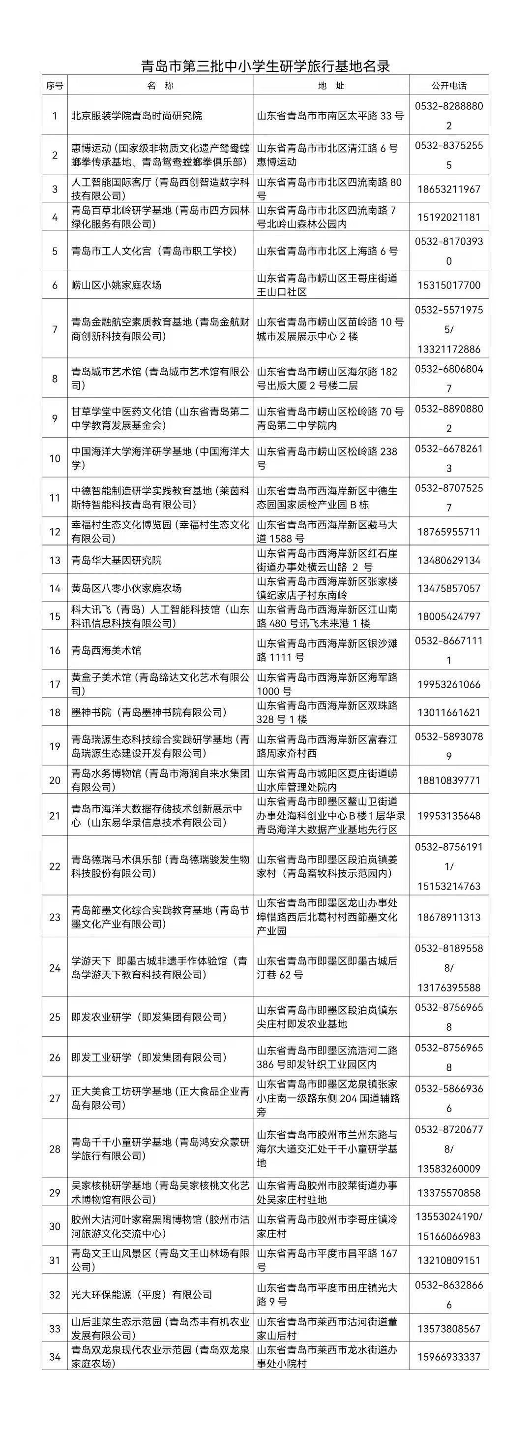 青岛市第三批中小学生研学旅行基地名录