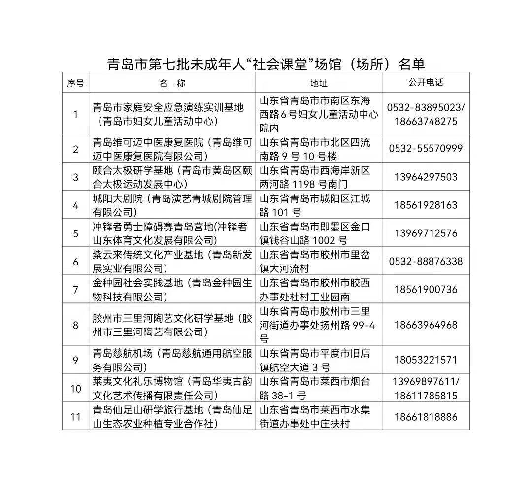 青岛市第七批未成年人“社会课堂”场馆(场所)名单