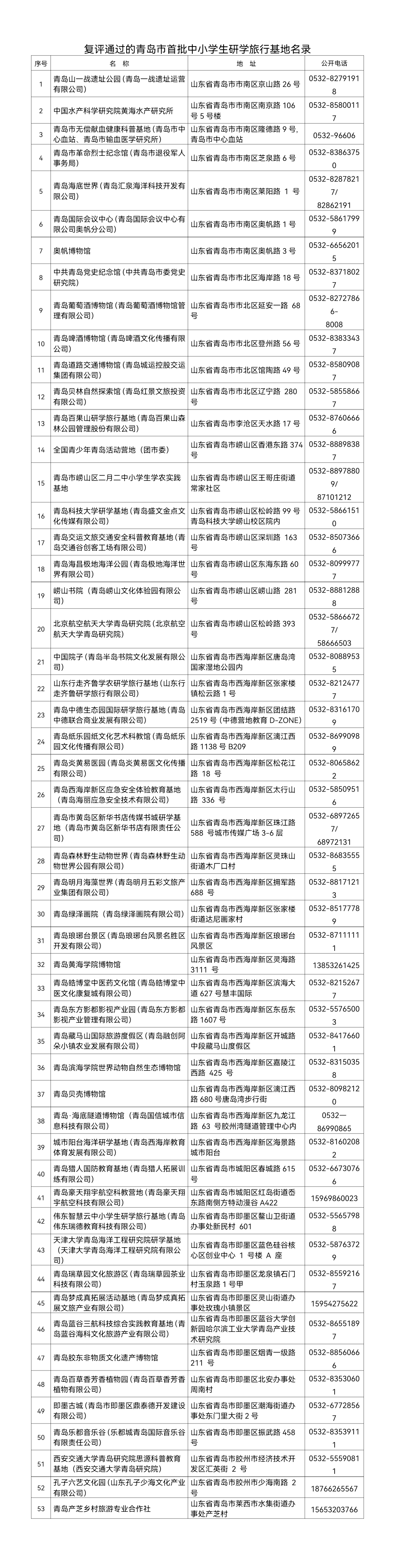 复评通过的青岛市首批中小学生研学旅行基地名录